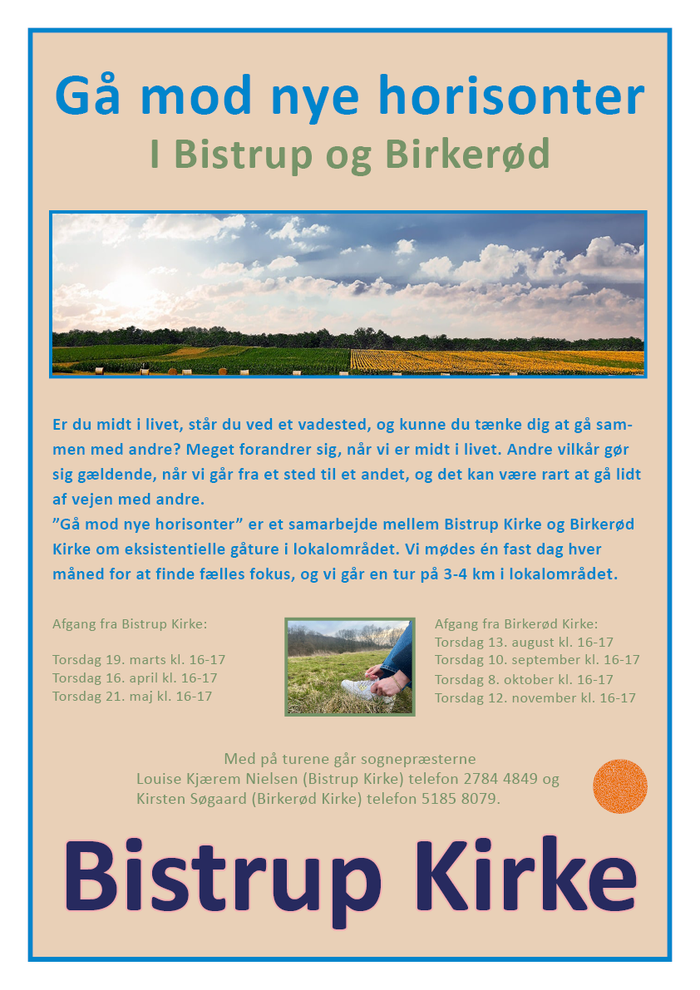 ”Gå mod nye horisonter” er et samarbejde mellem Bistrup Kirke og Birkerød Kirke om eksistentielle gåture i lokalområdet. Vi mødes én fast dag hver måned for at finde fælles fokus, og vi går en tur på 3-4 km i lokalområdet.