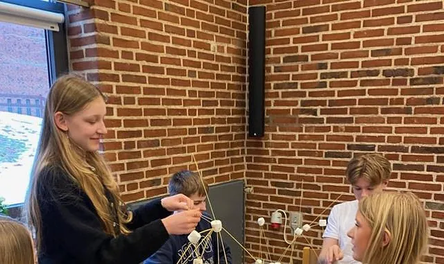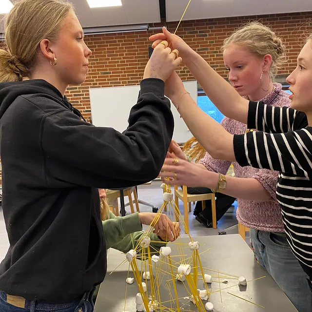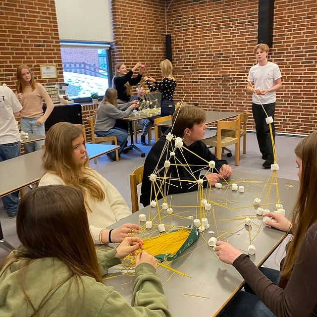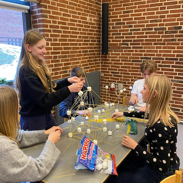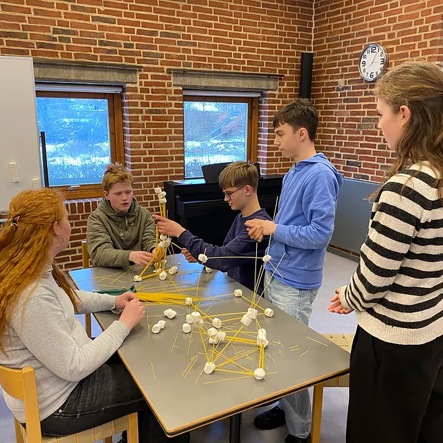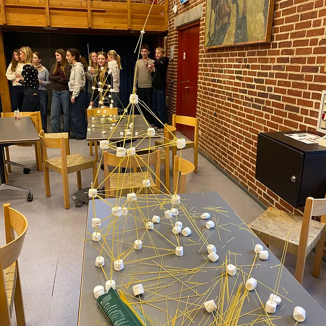 Koncentration, samarbejde og mange forsøg - konfirmandholdene 2025/26 bygger babelstårne af spaghetti og skumfiduser.